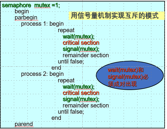 wait(mutex)和signal(mutex)操作必须成对出现,缺少P(mutex)将会导致系统混乱,不能保证对临界资源的访问,缺少V(mutex)将会使临界资源永远不被释放,从而使因等待该资源而阻塞的进程永远不能被唤醒。