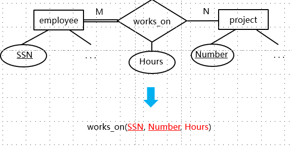 employee的主键SSN和project的主键Number) ,以及联系型本身的属性(图中works_on联系型的属性Hours)。 新关系模式的主键由两个实体型的主键组合而成(图中